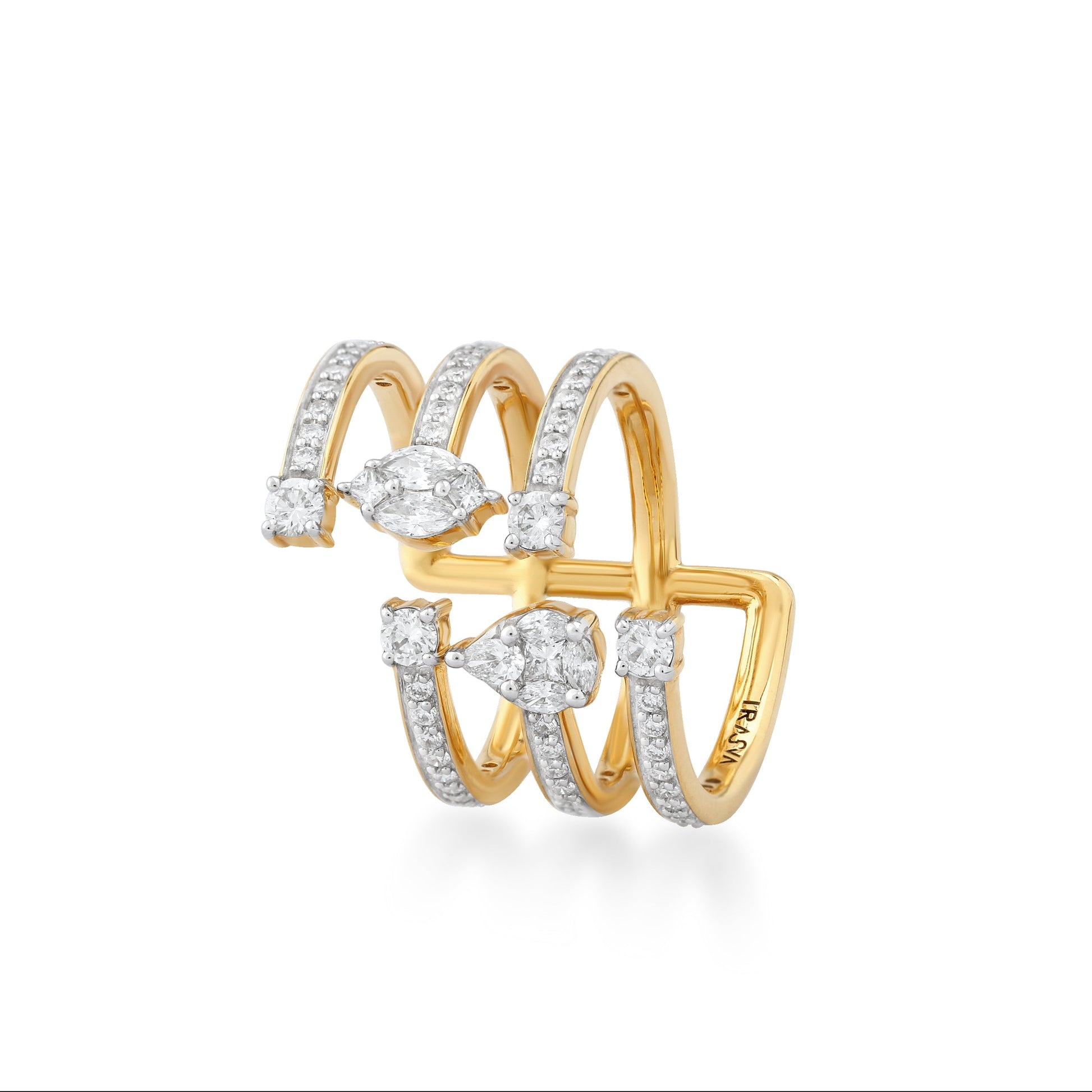 The abstract composition is light and breezy with two solitaires that twinkle on this triband beauty.