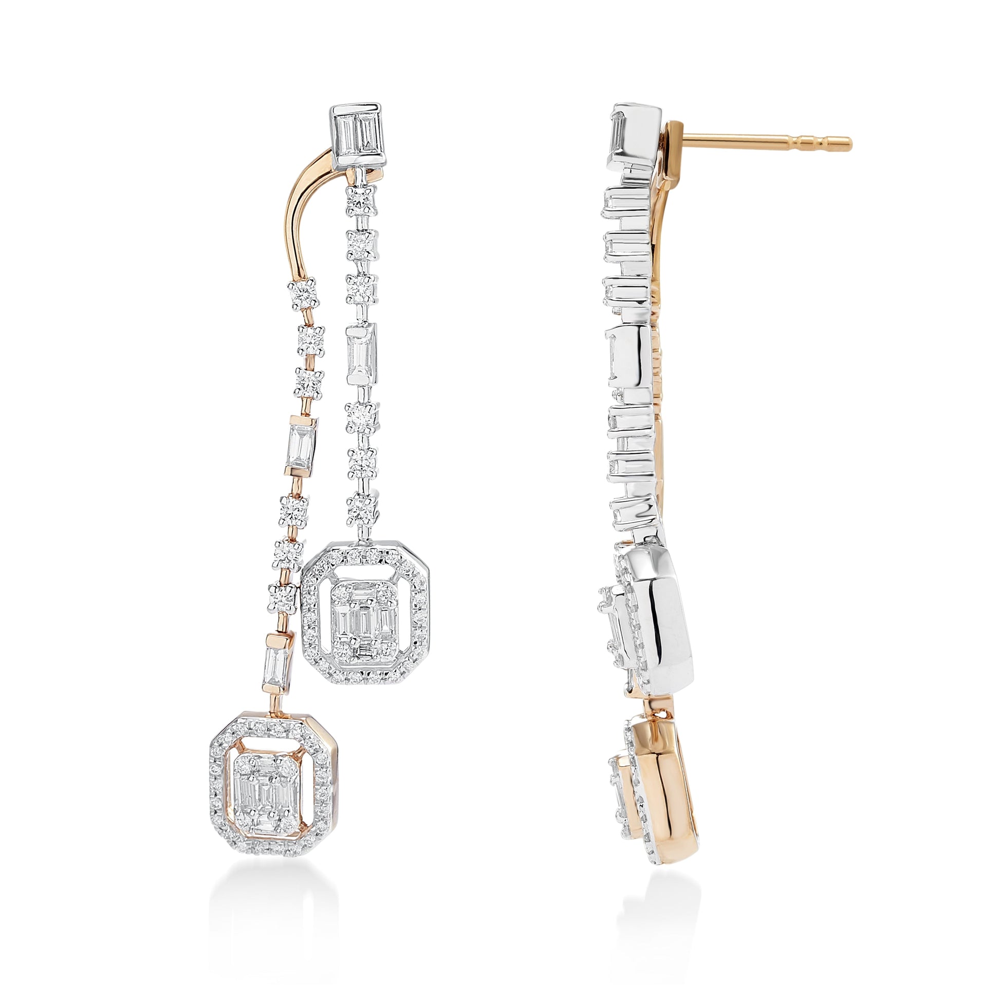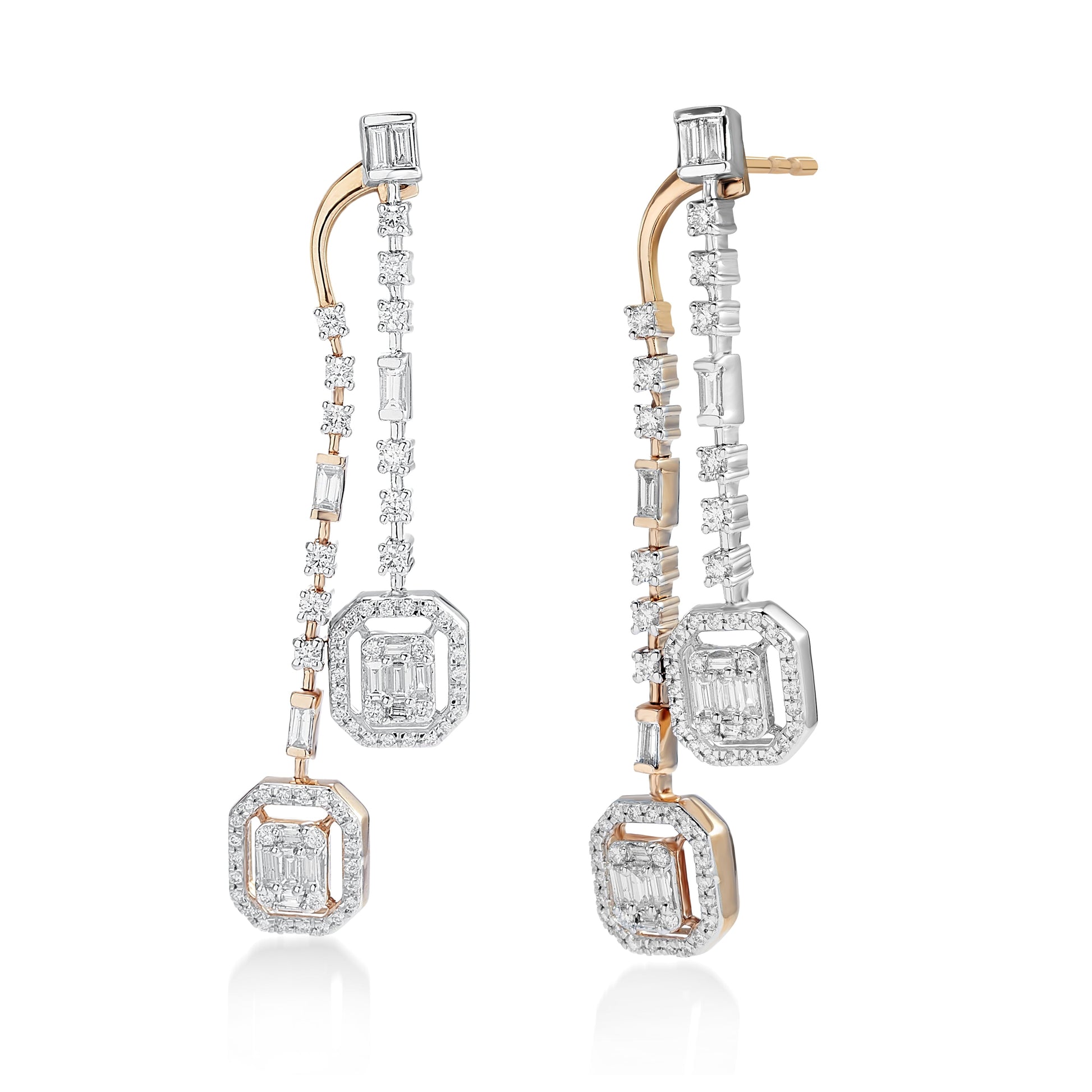 Strings of Diamonds falling like dewdrops on a plane surface, leaving droplets behind. Diamonds sit on Gold on these gorgeous earrings, with two parallel strands of starlight bouncing off the jewels.