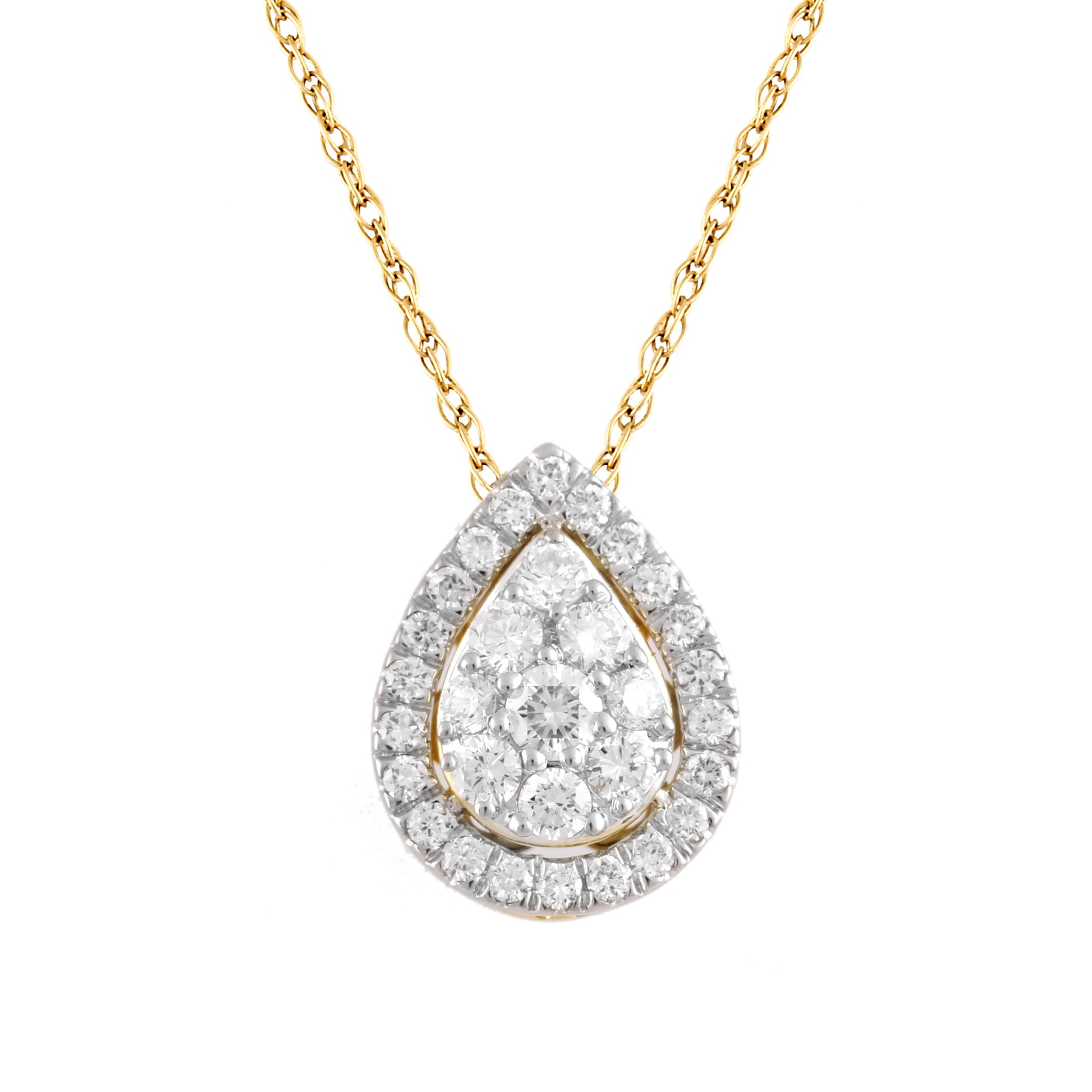 A celebration of purity and sparkle, an unsurpassed halo of Diamonds dance around a single pear-shaped stunner.