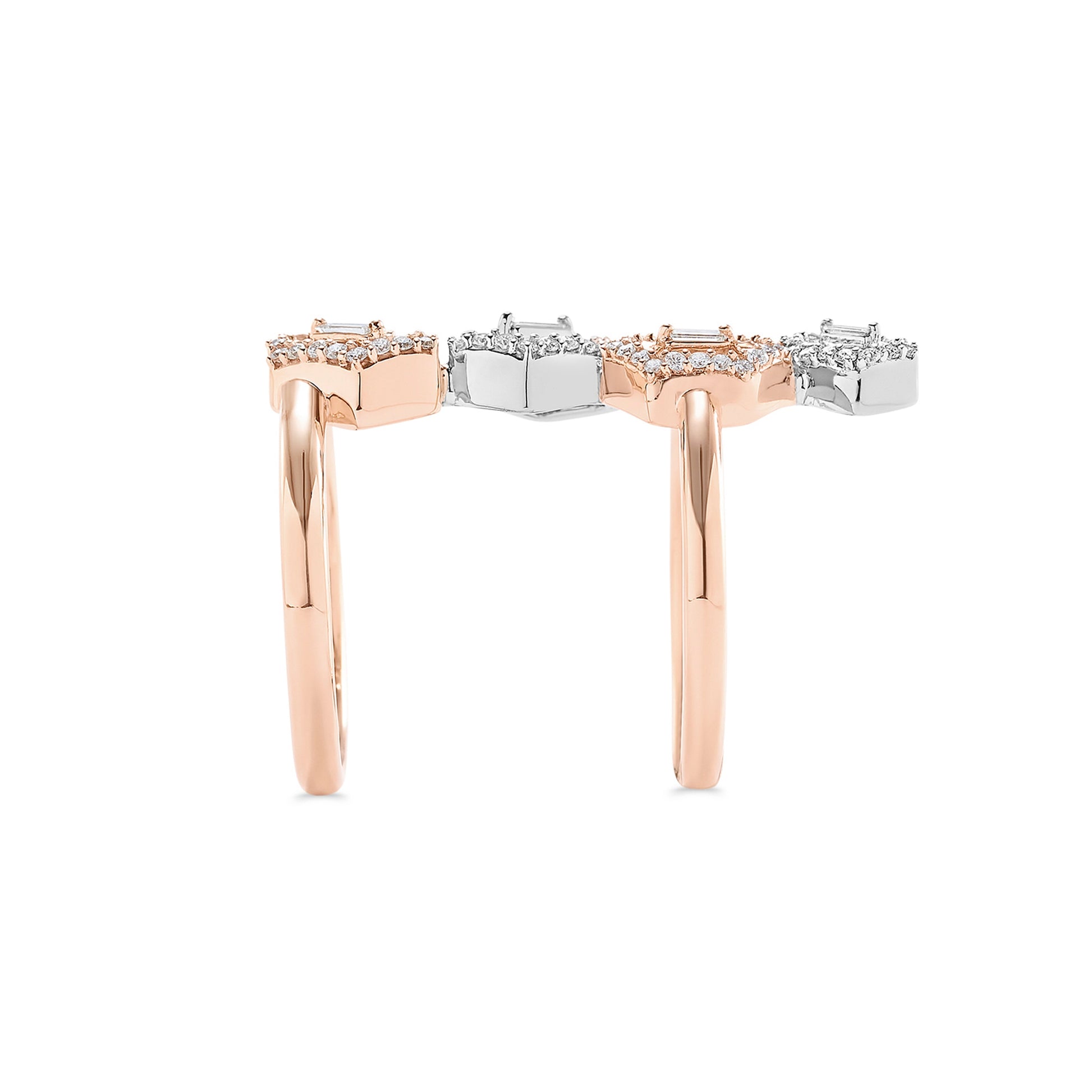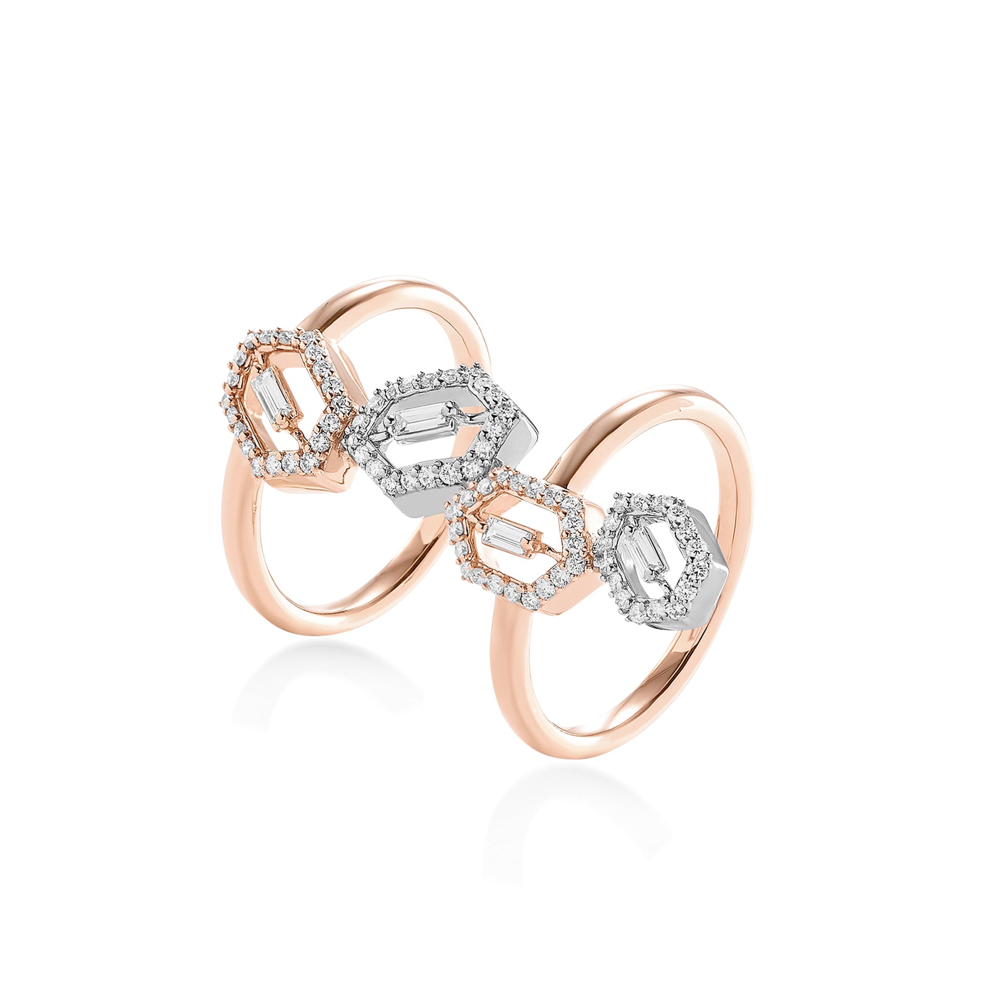 Unifying in design, a paisley is never set alone - it always has a mate, a partner. A twin floral shape, Paisley inspired this design of a dual ring, connected by Diamonds, separated by a beautiful pattern. This intrinsic yet bold ring was named after its muse.
