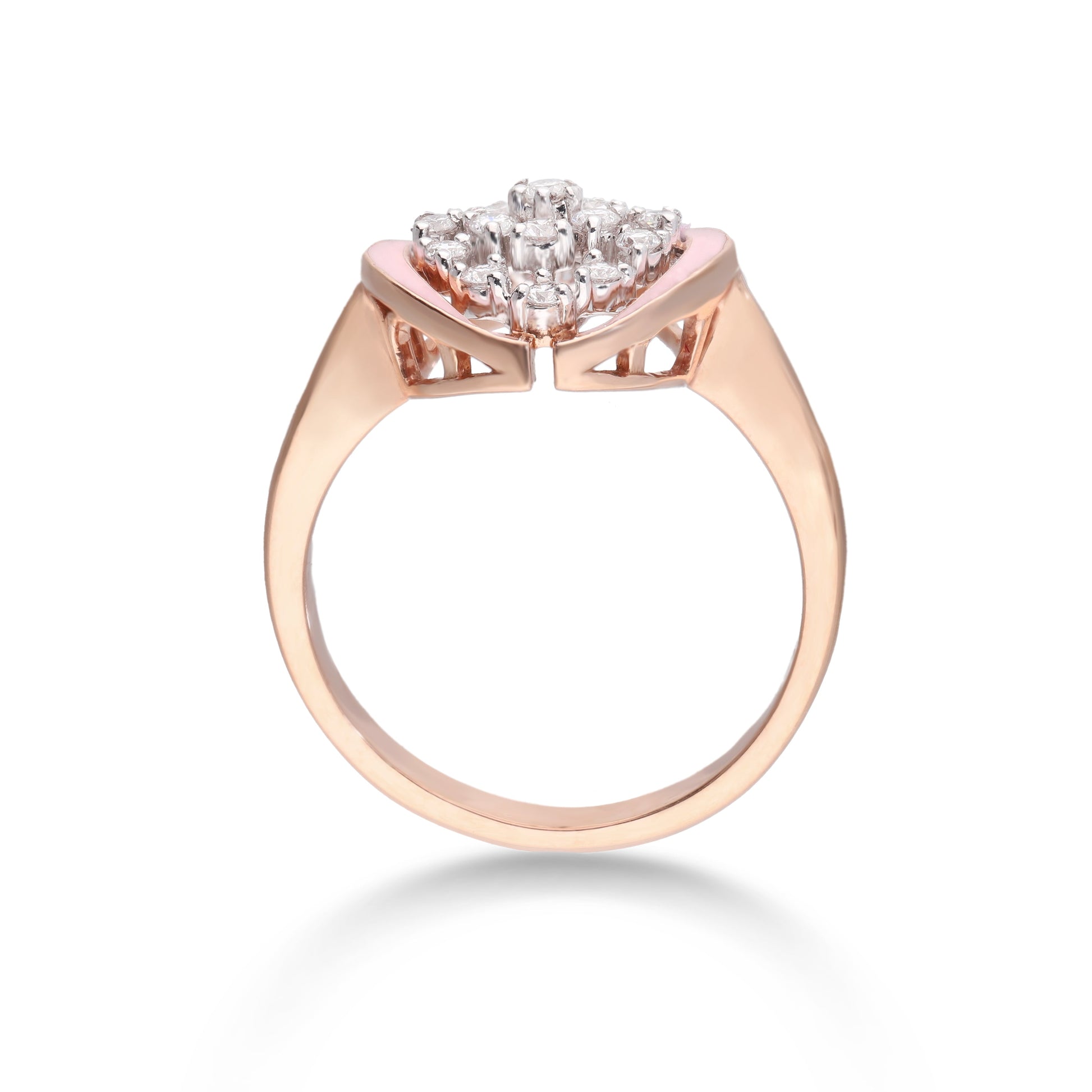 A rose hued halo frames this magnificent sparkler. With a classic and sophisticated design, this ring denotes chicness and a shimmering statement of royalty.