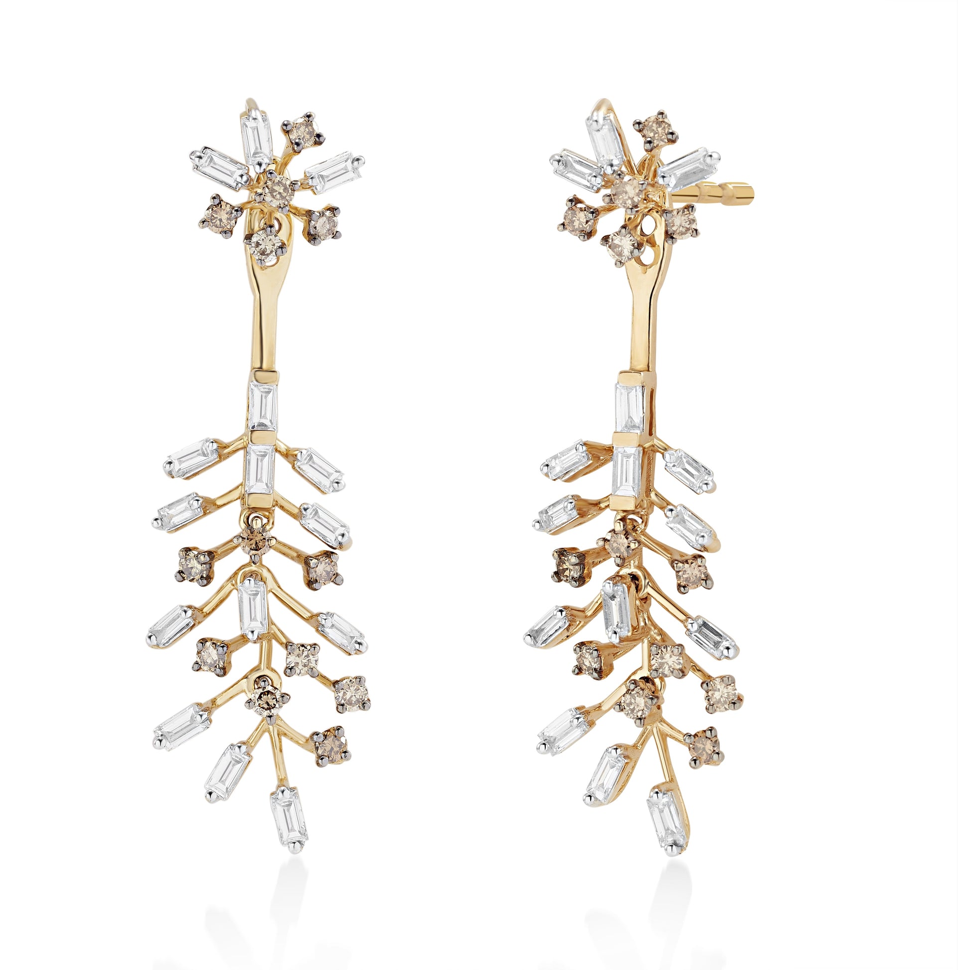 Drooping off a leaved stem, this Diamond and Gold plant sits at the wearer's ears, whispering stories of butterflies and birds, forests and gardens. The beautiful rendition of leaves on a branch with a floral top is called Fronda, meaning a leafy branch.