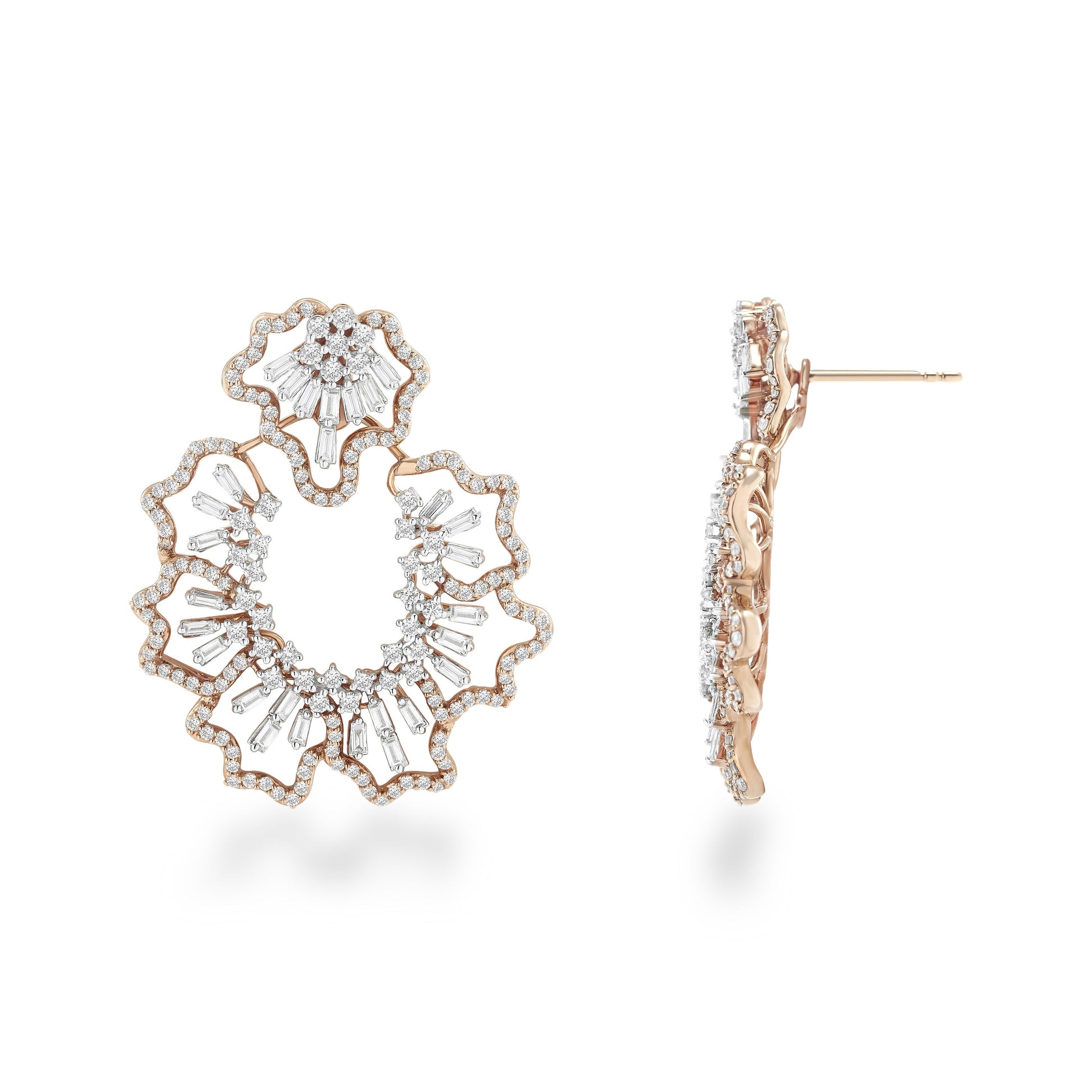 Nearidei is a Cambodian born, white flower that blooms with four distinct petals. Set in a hoop with leaves all around it, a tiny white Diamond flower sits in Gold, at the wearer's ears as majestic, sparkling earrings.