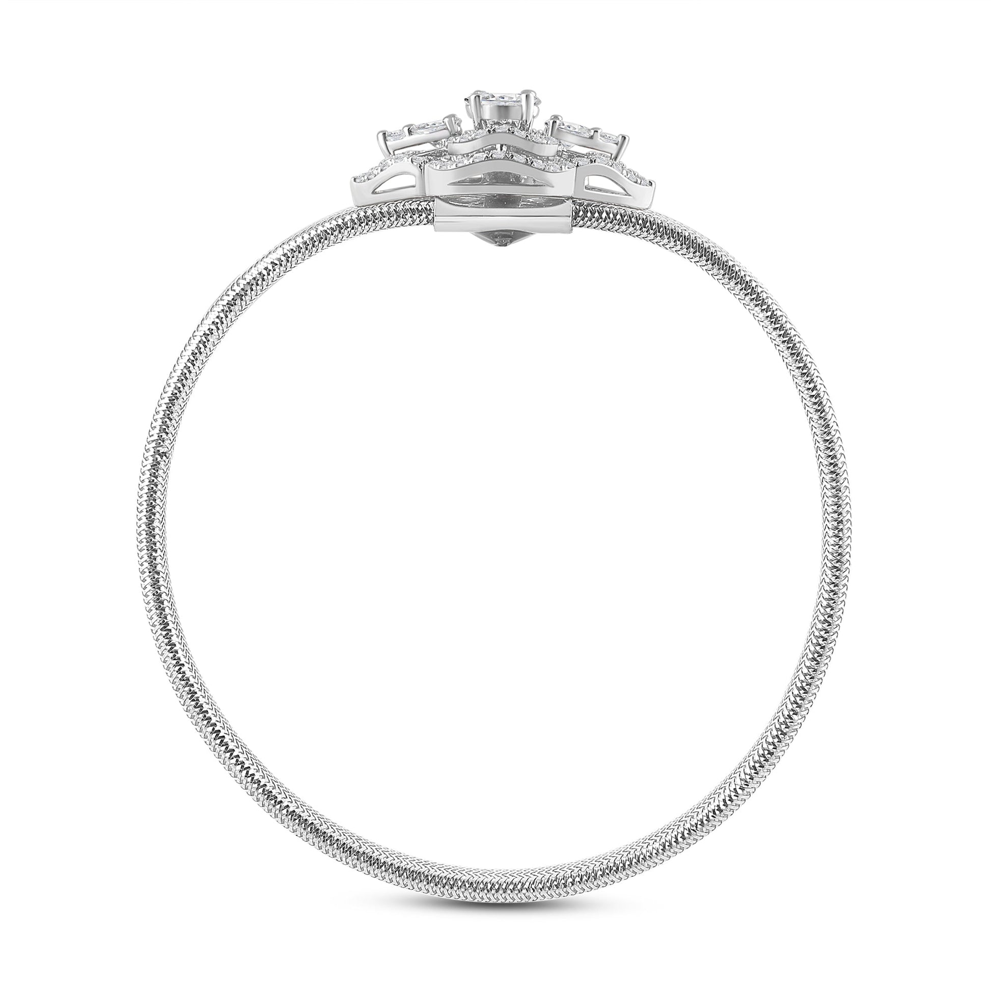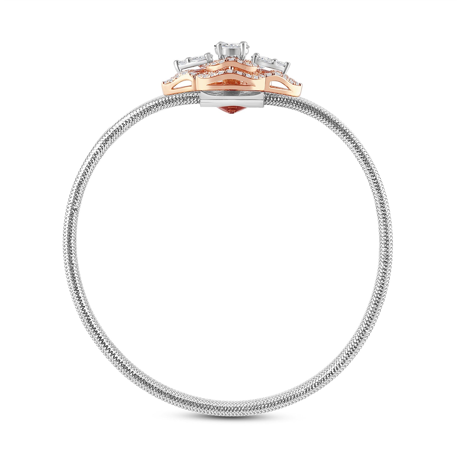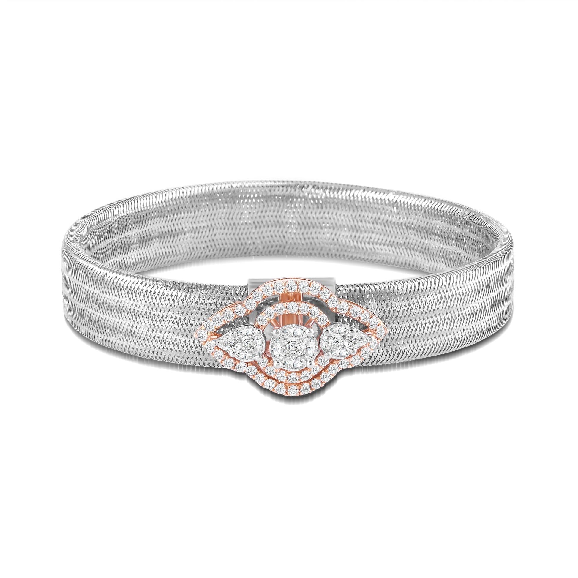 The Selene Leora Stretchable bracelet embodies celestial elegance. Crafted with textured stretchable bands of muted grey, it is crowned by a radiant cluster of diamonds framed in striking rose gold. The harmonious contrast of metals and the intricate design evoke the serene glow of moonlight.