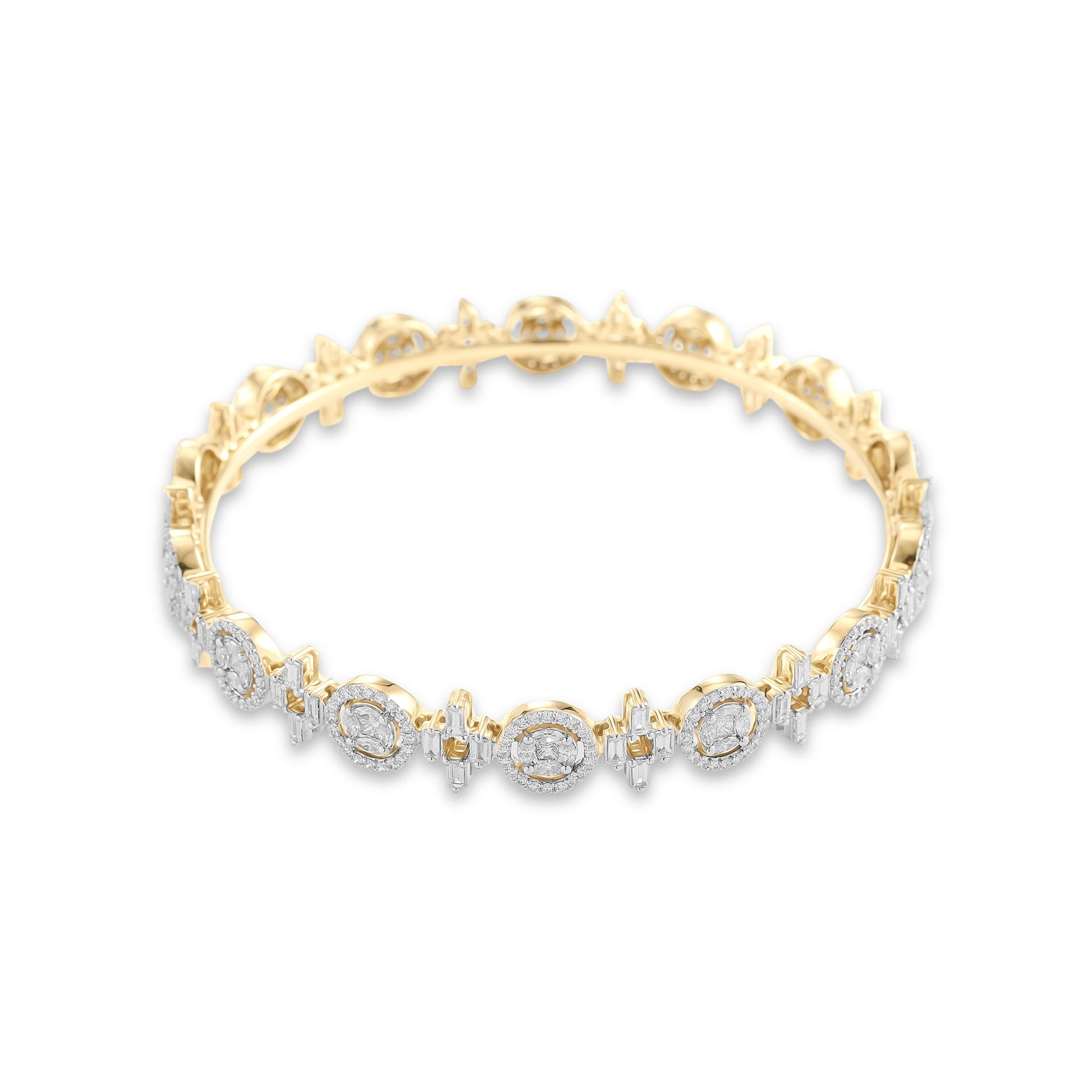 A perfect fusion of geometry and art, this bangle denotes stability at its finest. The Sora Bangle, delicate and intricate, is made of the two strongest shapes - the circle and the cross. Moulded with Gold and studded with Diamonds, this rendition of strength is named after the beautiful bird.