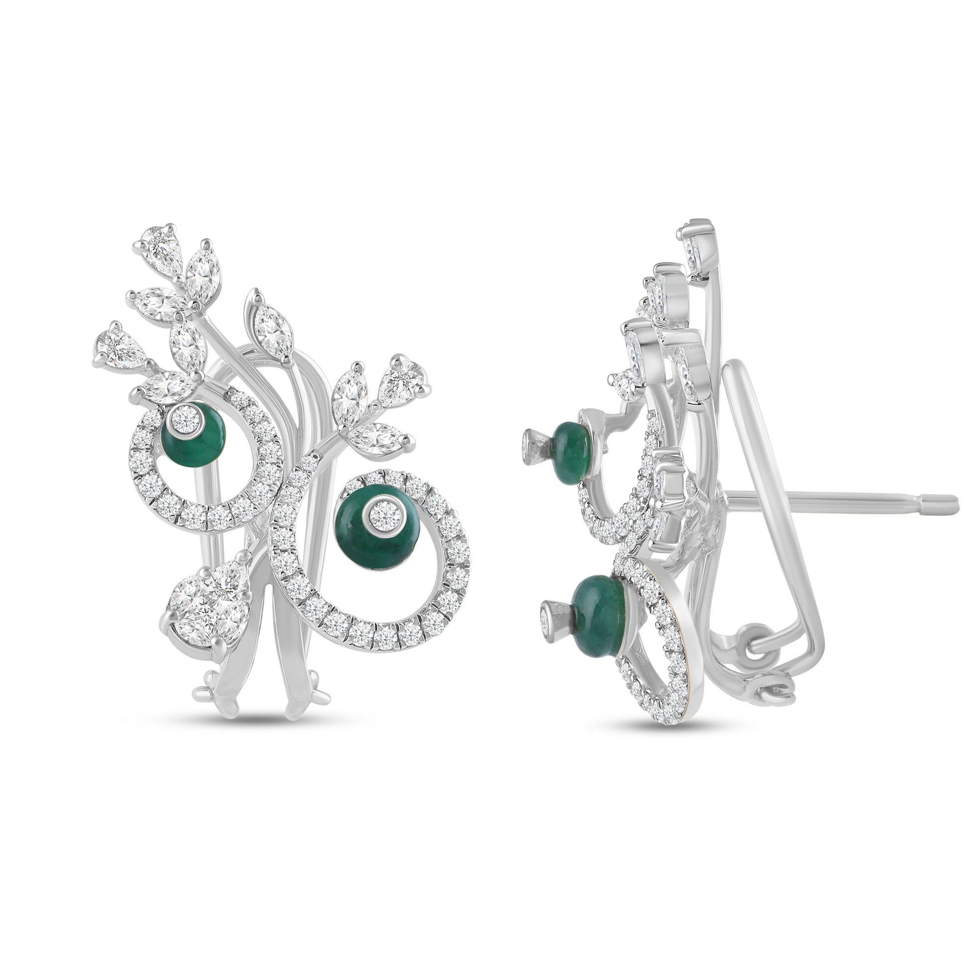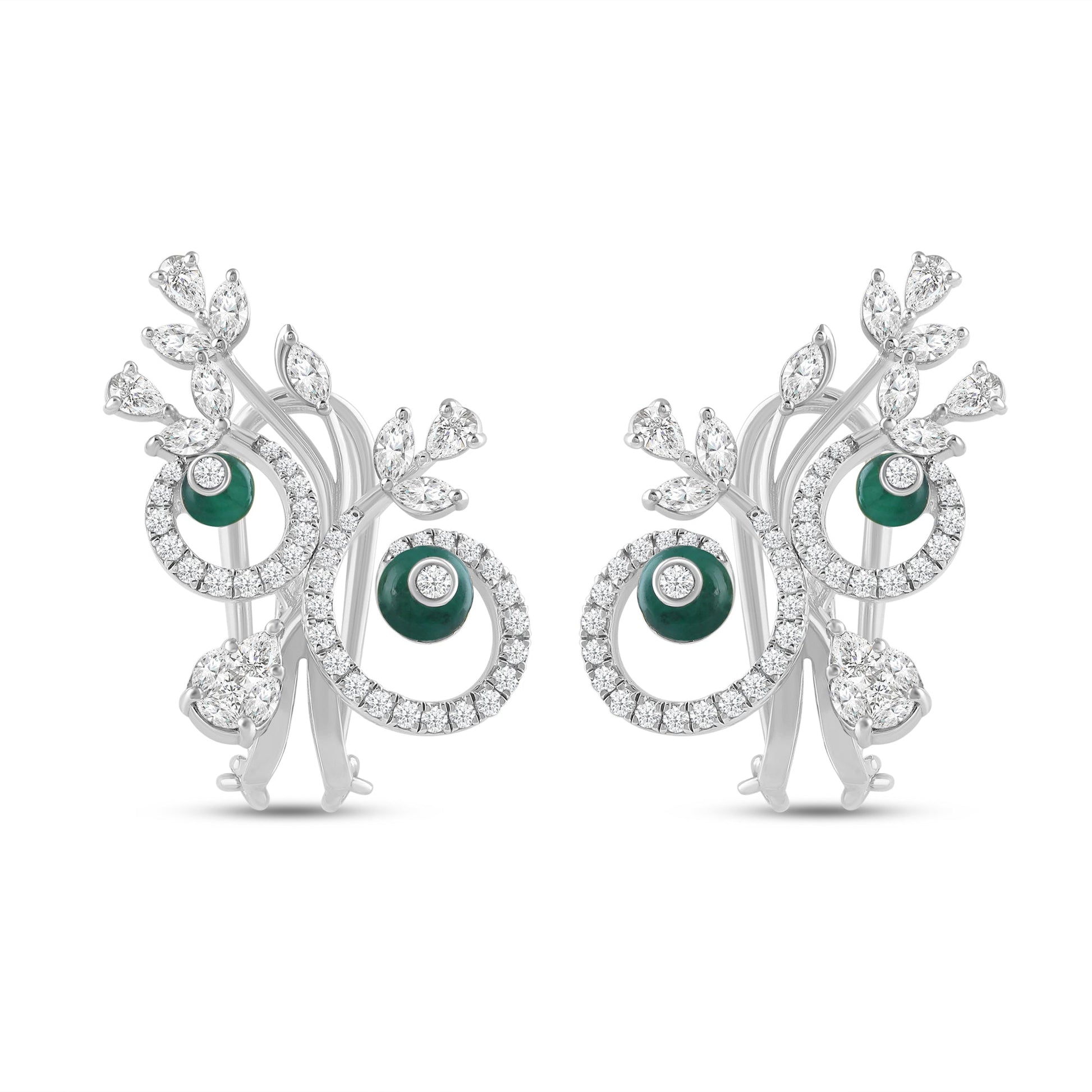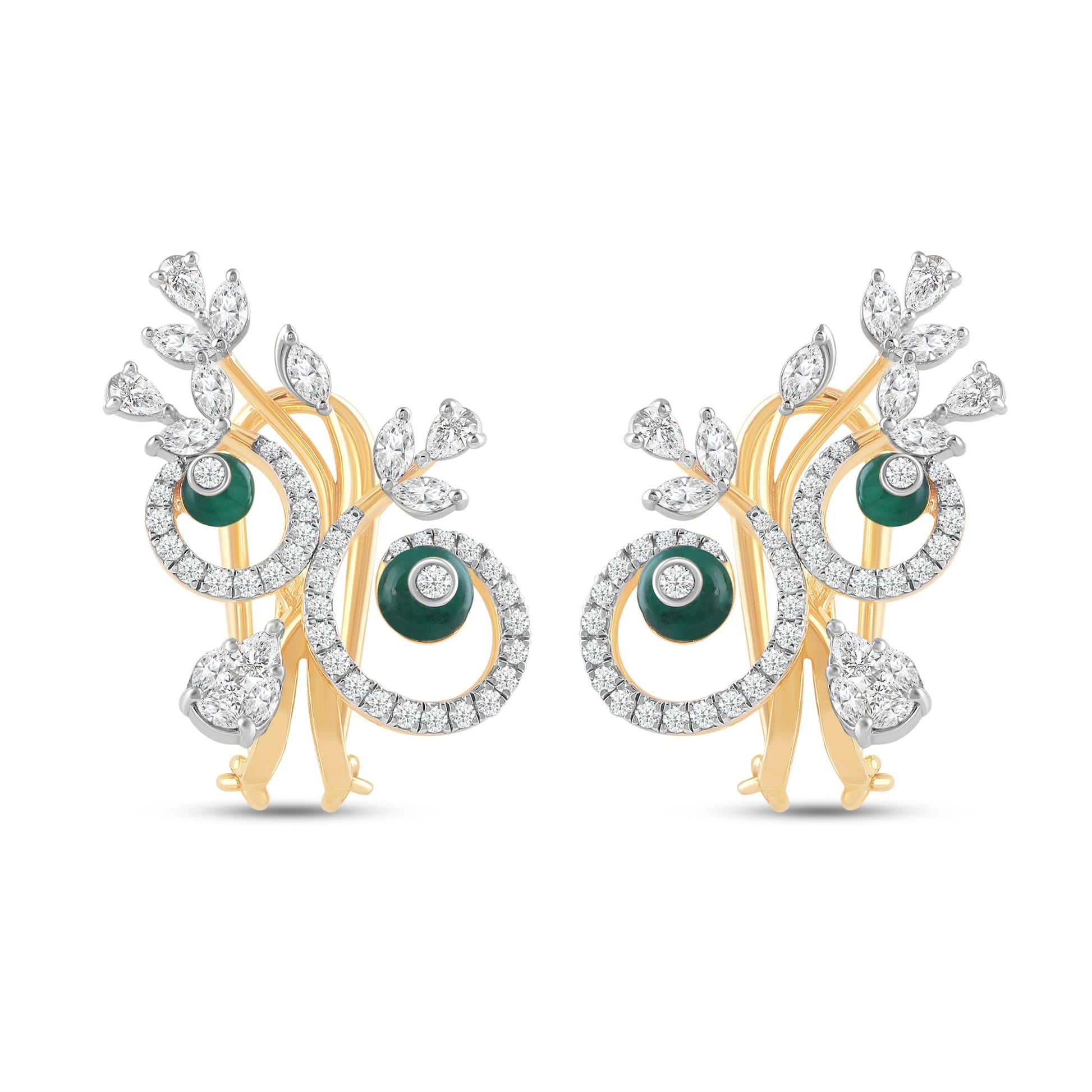 The Verdure Colour Couture earrings are a statement in sculptural elegance. Swirling golden vines cradle rich green emeralds, and delicate diamond-set motifs crown them like peacock plumes. These are a perfect blend of traditional and contemporary design.